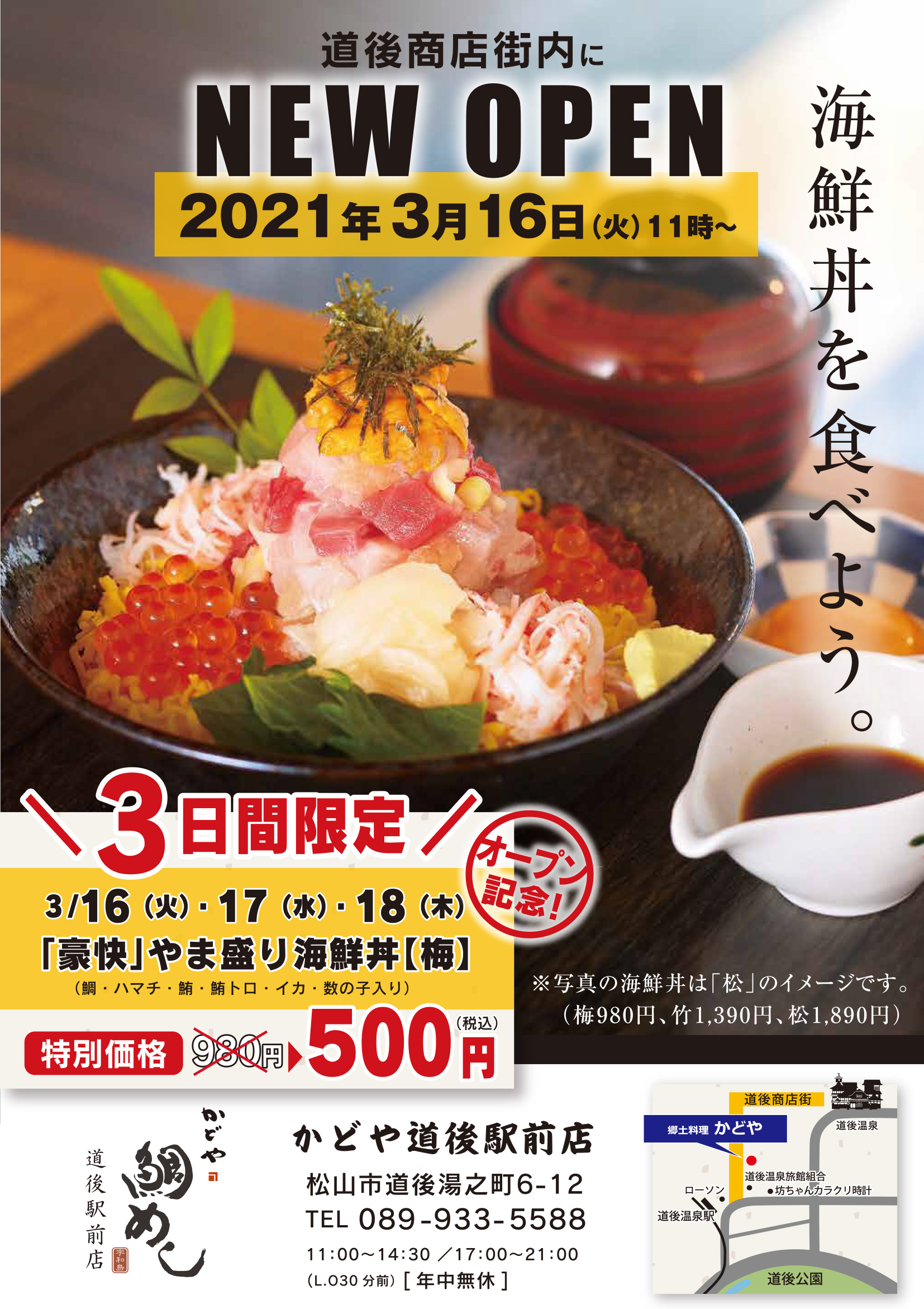 【かどや道後駅前店】海鮮丼が3日間OPEN限定価格!