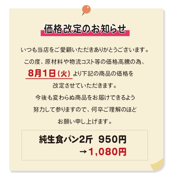 純生食パン(2斤)の価格を値上げさせて頂くことになりました。