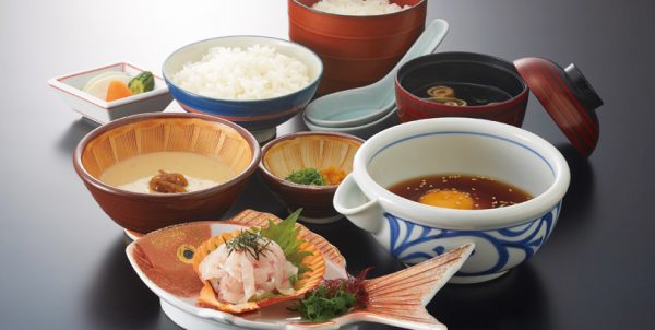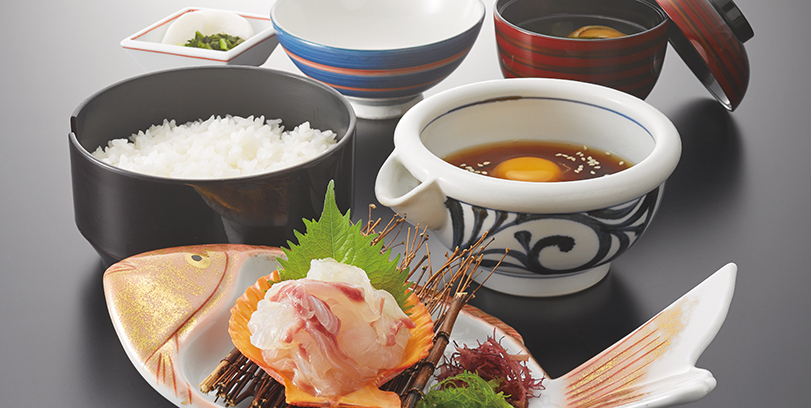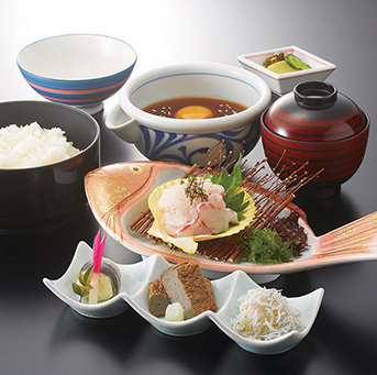 新鮮な鯛の刺身を生卵の入った特製のだしと混ぜ、薬味とともに温かいご飯にかけて食べる「宇和島鯛めし」と宇和島の郷土の味三品(しらすおろし、じゃこ天、丸ずし)を一緒にお楽しみいただける豪華な御膳です。