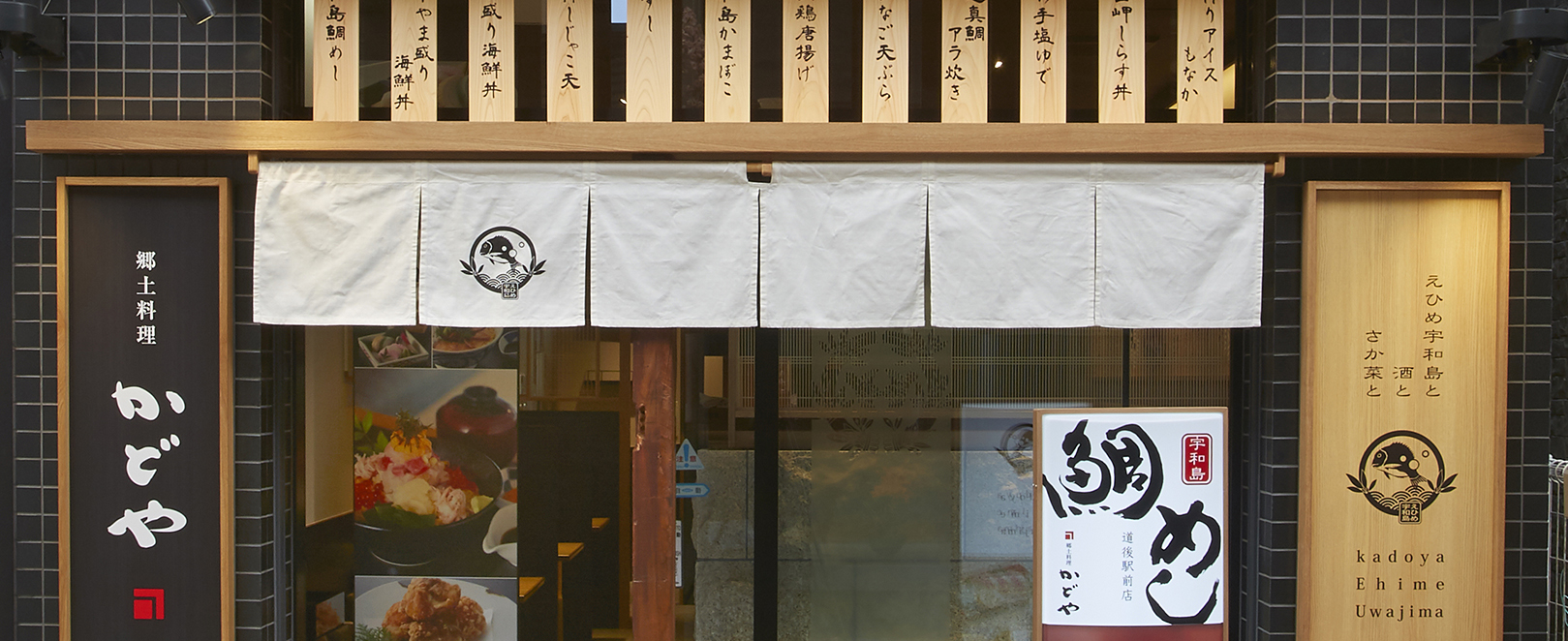 - 当店では、郷土料理をはじめ、宇和海の海の幸を使用した逸品料理もおすすめです。また、かどやが厳選した愛媛の地酒や愛媛産柑橘を使用した各種ドリンクも取り揃えておりますので、ぜひお越しください。