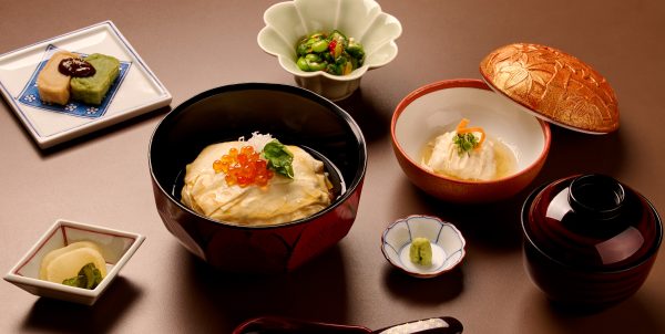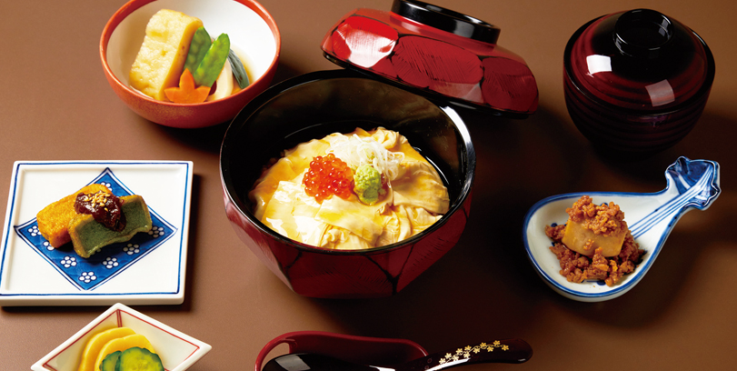 優しい味わいの餡かけ丼に季節の前菜と甘味が付いた贅沢御膳。