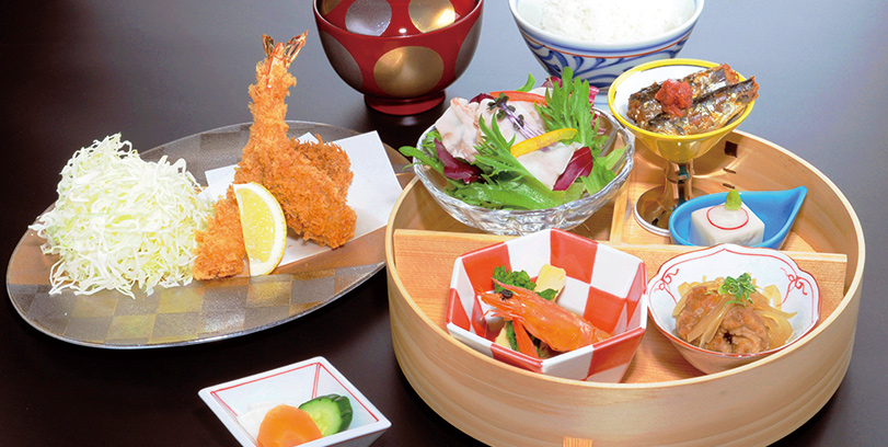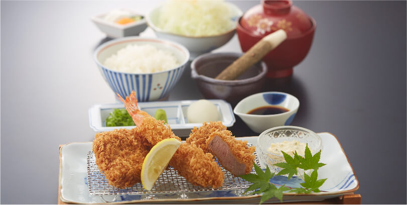 ロースかつとひれかつ、天然海老フライを同時にご堪能いただけるお膳。
